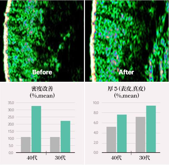 皮膚の真皮の密度及び厚さが増加して皮膚の保護膜再生させます。よって皮膚が全体的に健康で自然な弾力ができます。
