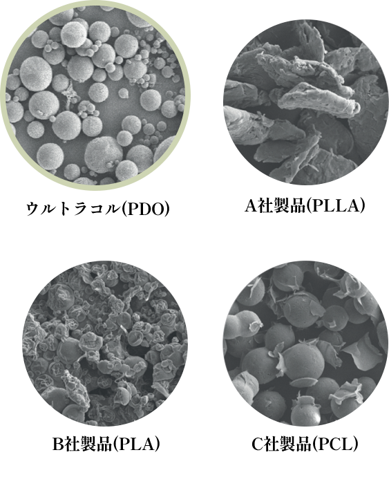 ウルトラコルは均一な丸形で他社の製品と比べて一番安全なCollagen Stimulatorフィラーです。