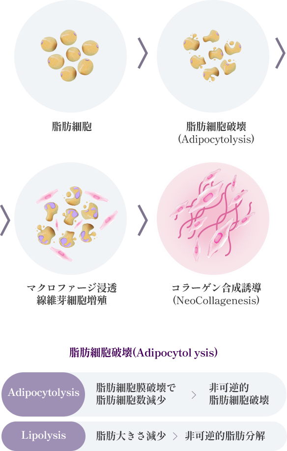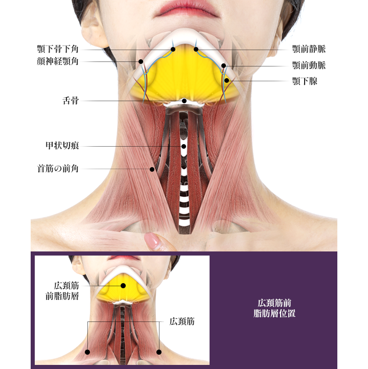 顎下の脂肪減少効果及び安全性が認められた薬剤を注入して脂肪細胞を破壊し、コラーゲン生成を促進して肌のハリや弾力の改善に役立ちます。
