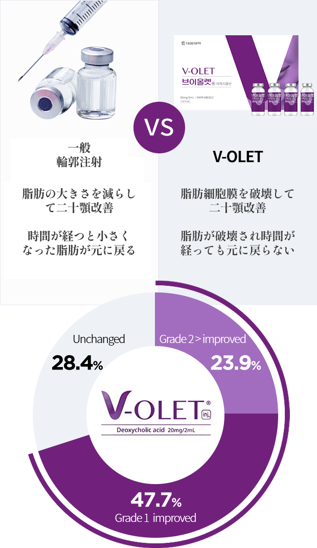 V-OLETを注射した人の71.6%が二十顎減少に効果が表れました。