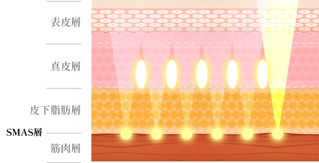 高強度集束超音波を利用し皮膚真皮層と皮下脂肪層、SMAS(筋膜)層まで奥深く熱エネルギーを伝達します。施術後真皮層のコラーゲンとエラスチンが生成されます。